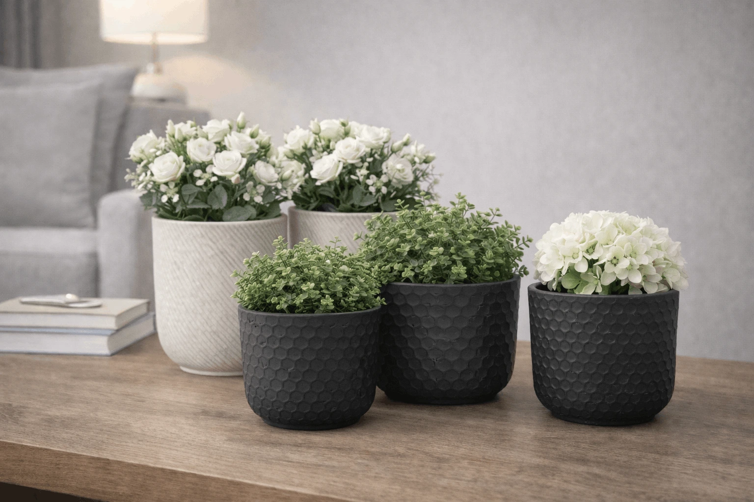 Kit 5 Vasos Decorativos Vite e Beta – Polietileno Premium Preto e Calcareo para Decoração de Ambientes