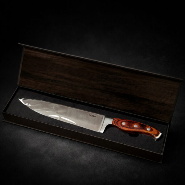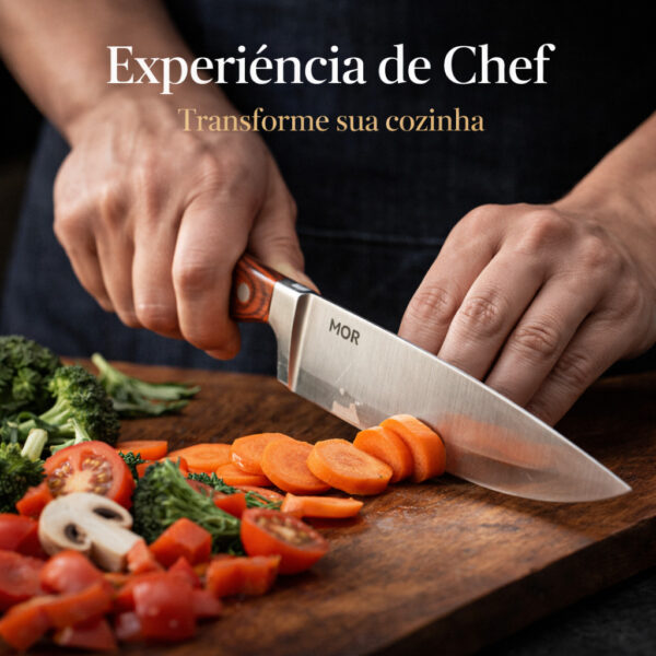 A Faca Chef MOR Steel 8¿¿¿ foi criada para transformar completamente sua experiência na cozinha. Com lâmina em aço inoxidável de alta qualidade e cabo em madeira elegante, ela oferece cortes extremamente precisos, mais segurança no manuseio e muito mais agilidade no preparo dos alimentos.