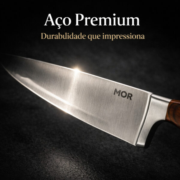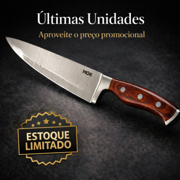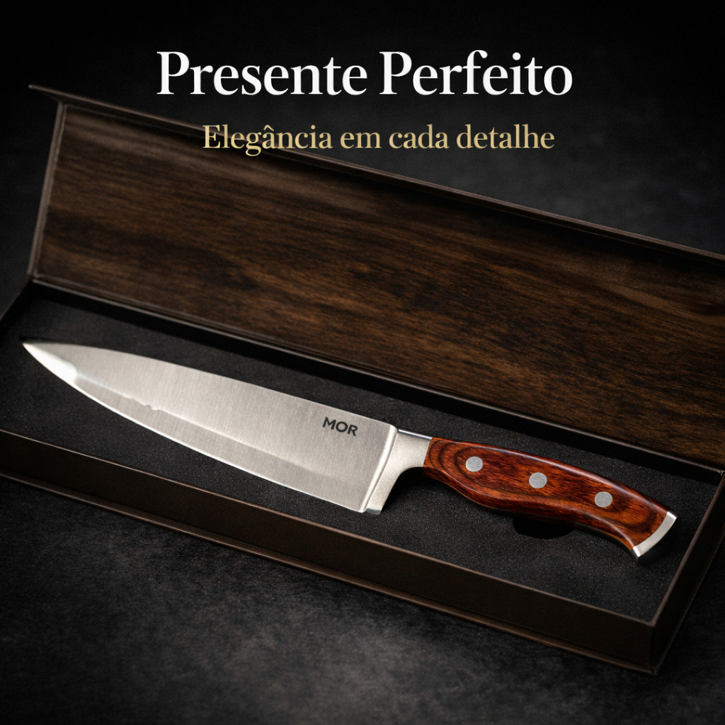 A Faca Chef MOR Steel possui um design elegante e acompanha embalagem sofisticada, sendo uma excelente opção de presente para quem ama cozinhar ou aprecia utensílios de cozinha de qualidade.