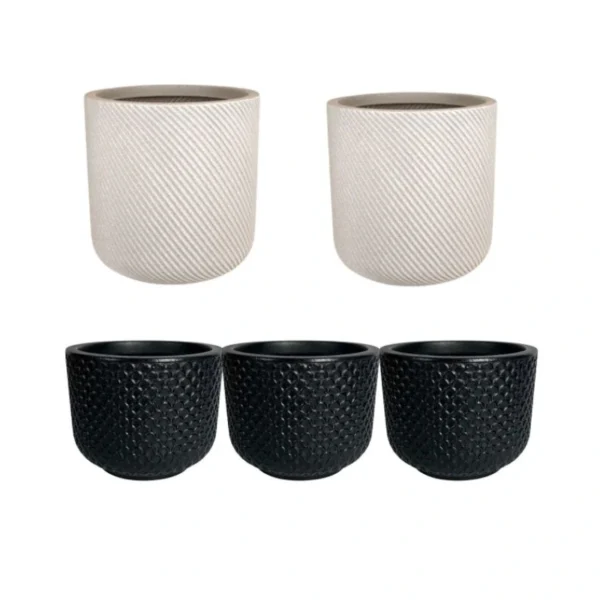 O conjunto é composto por 2 vasos modelo Vite na tonalidade calcário e 3 vasos modelo Beta na cor preta, formando um contraste visual elegante e profissional na decoração.